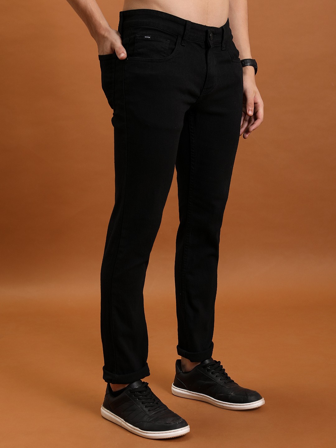 Dark shade, no fade black jeans with a skinny fit and mid-rise waist. Designed for a clean look with stretchable fabric and a 5-pocket style, perfect for casual wear.