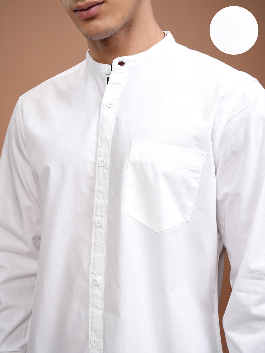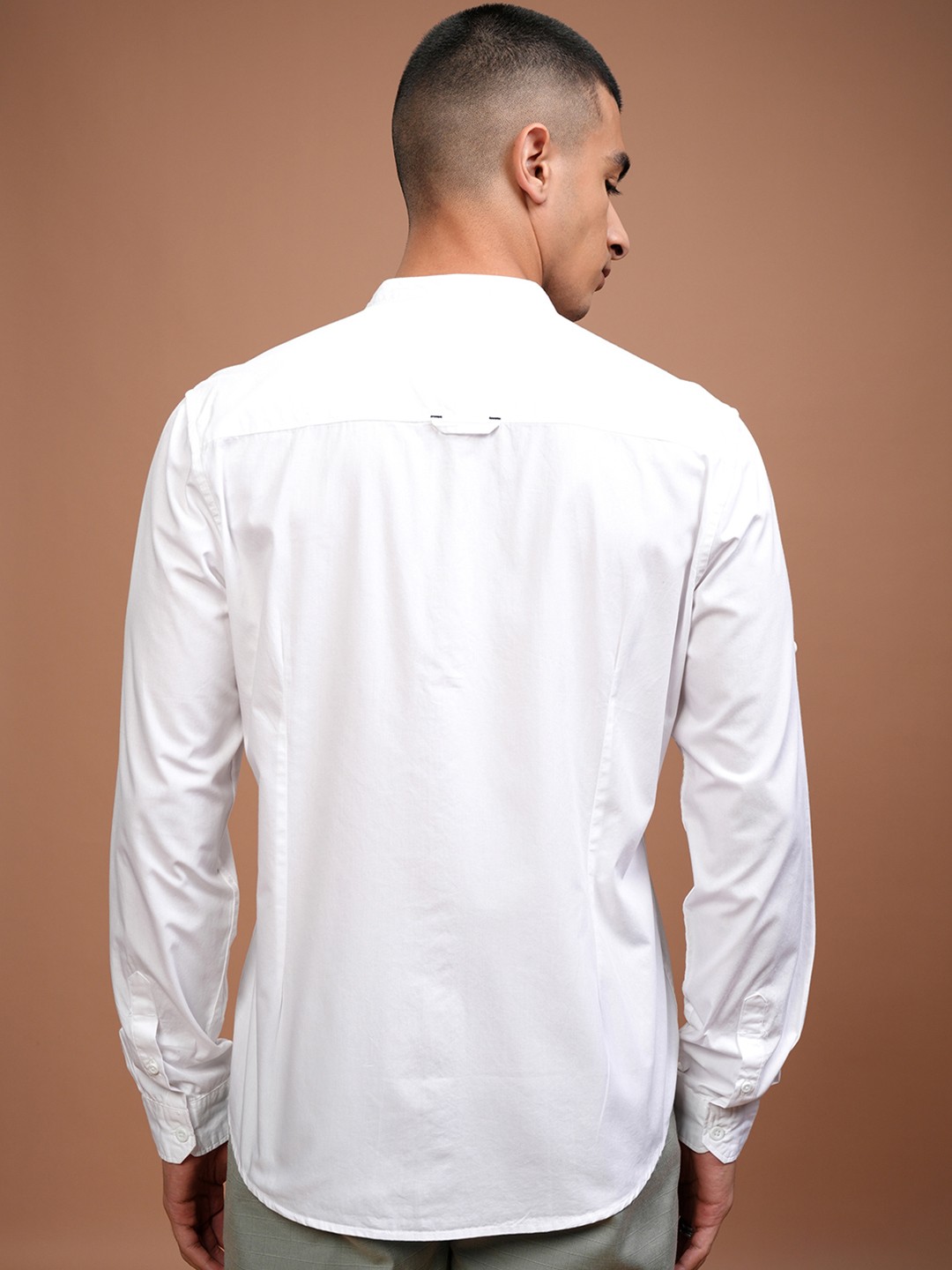 White solid casual shirt, has a mandarin collar, a button placket, 1 pocket, long sleeves with roll-up tab features, curved hem